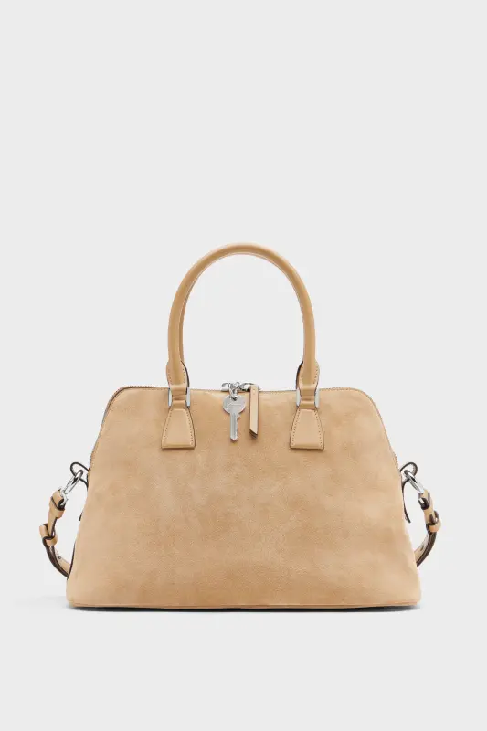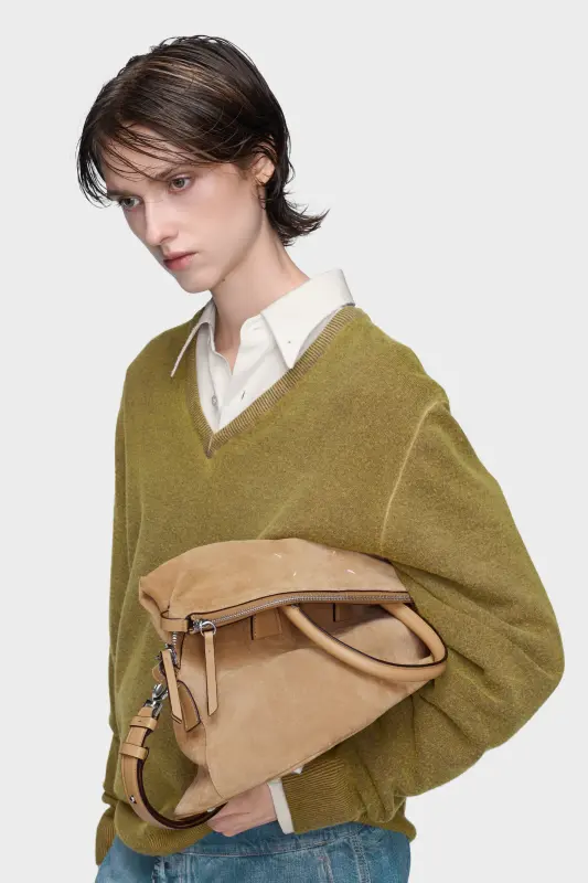 The 5AC Soft Medium brings a textural edge to the Maison’s icon. Shaped in suede leather, the pliant body collapses into folds, revealing a silhouette in motion. Top handles and a detachable strap ground the design in versatile function. The iconic 5AC line takes its name from the French word 'sac' (bag). It explores the Maison’s Anonymity of the lining concept. At the front, four white stitches affirm its signature.