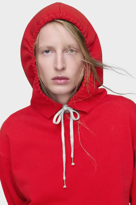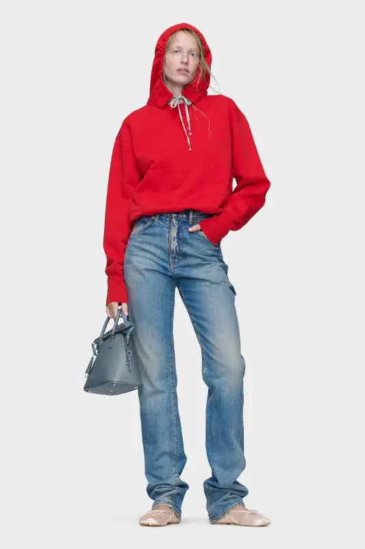 A hooded sweatshirt in cotton jersey, complete with a front pouch pocket and elongated drawstrings. Ribbed finishes secure the relaxed construction, grounding a piece that merges comfort with quiet precision. At the back, the Maison’s signature four stitches appear; the opposite of a label.