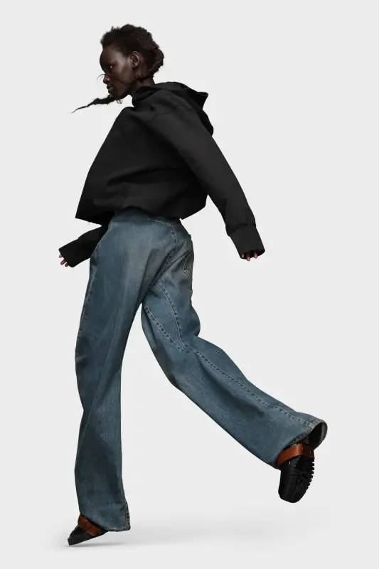 The hooded sweatshirt comes in firm cotton fleece with a raw-cut hem and missing drawstring at the neck for an unfinished aesthetic. The chest features tonal Maison Margiela embroidery. Maison Margiela's signature, the Four stitches, appear at the back; the opposite of a label.