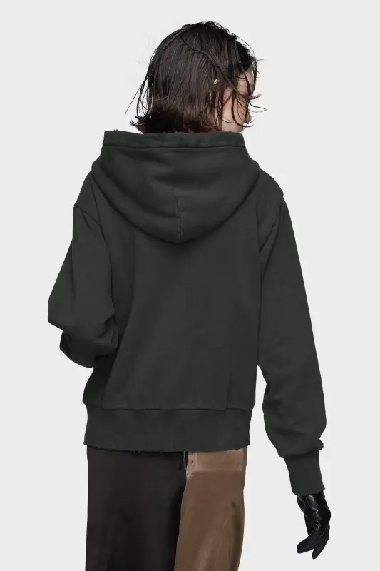 This hooded sweatshirt offers a softer take on a casual staple. Crafted in cotton, its ribbed trims and raw hems suggest wear through time. The discreet ‘MM’ embroidery finishes the piece with the Maison Margiela signature. The four stitches appear at the back; the opposite of a label.
