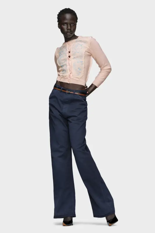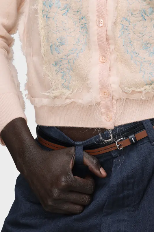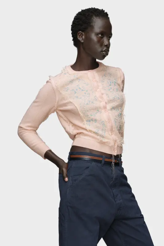 This cardigan is framed by contrast, with appliqué patches that resemble the reverse side of delicately embroidered fabric. Vertical stitch lines mirror the inside of a garment, aligning with the Maison’s décortiqué approach. Maison Margiela’s signature, the four stitches, appear at the back; the opposite of a label.
