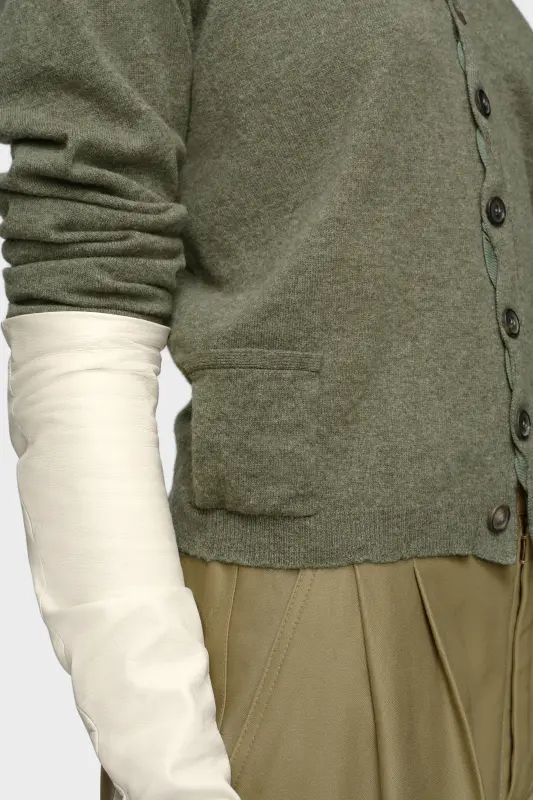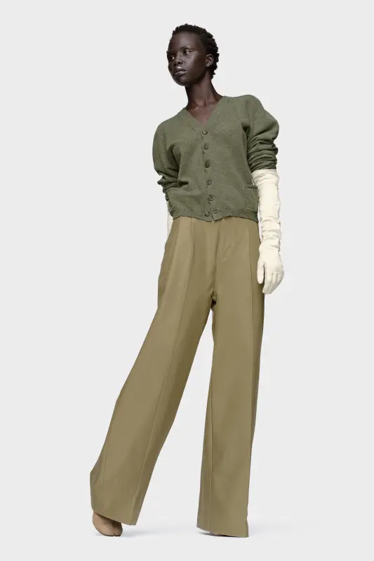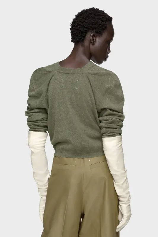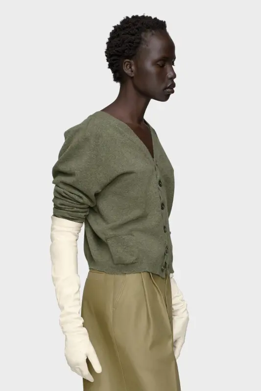 A cropped silhouette and shoulder seam detail bring quiet volume to this wool cardigan. Its V-neckline and neat button placket offer a refined frame, while the irregular front pockets introduce discreet subversion. At the back, the Maison’s signature four stitches appear; the opposite of a label.