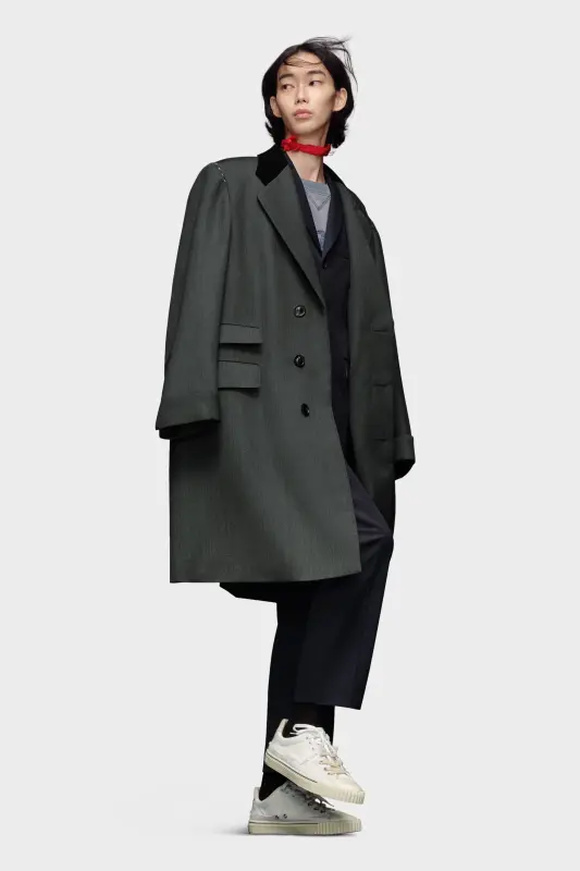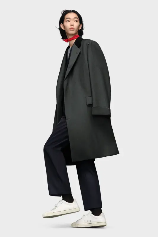 The wool coat features the Maison's work-in-progress stitch details at the shoulders with asymmetric flap pockets and a hidden buttoned placket for a clean aspect. It features a contrast collar and sleeves that can be rolled up to showcase the lining. Margiela's signature, the four stitches, appear at the back; the opposite of a label.